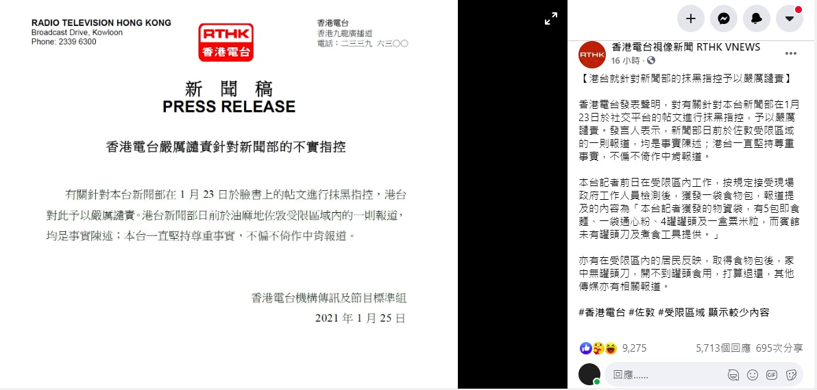 《香港電台》則發聲明,強調一直尊重事實中肯報道,不點名譴責帖文的抹黑指控。 上周六香港電台發布一張相片,顯示該台記者在封鎖區內獲發物資,包括有 5 包即食麵、一袋通心粉、4 罐罐頭及一盒粟米粒,並稱「賓館未有罐頭刀及煮食工具提供」。