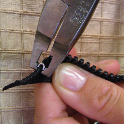 / How To Stop Zipper From Unzipping - Peel back any fabric that is covering the zipper stop and place your thumb and forefinger on the top of the zipper stop, on the side with the slider.